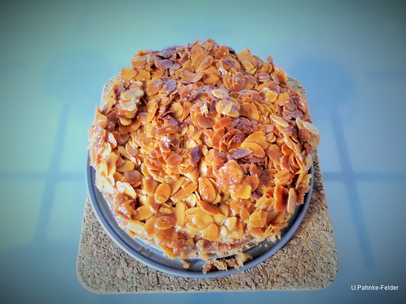 Kuchen zurück in den Ofen und für weitere ca. 15 Minuten fertig backen. Darauf achten, dass die Mandeln NICHT zu dunkel werden.