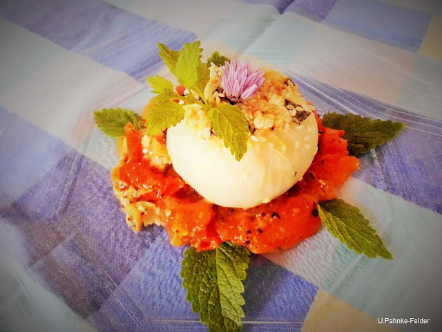 Teller mit einigen Blättern der Zitronenmelisse dekorieren. Tomaten zu einem Spiegel ausstreichen, Mairübchen mittig aufsetzen und mit einigen Blättern der Zitronenmelisse und jeweils einer Schnittlauchblüte dekorieren.
