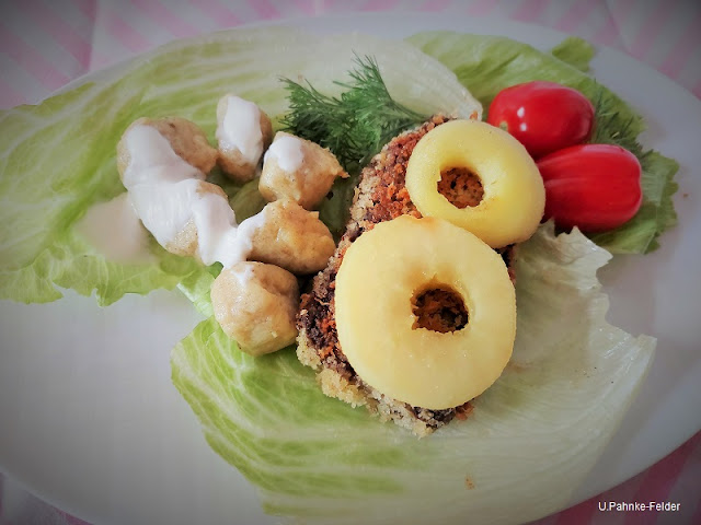 Nun richte ich meine Entenleberpasteten-Schnitzel auf einem Teller an. Der Fantasie sind hierbei keine Grenzen gesetzt. Ich habe z. B. den Teller mit einigen Blättern Eisbergsalat ausgelegt ...